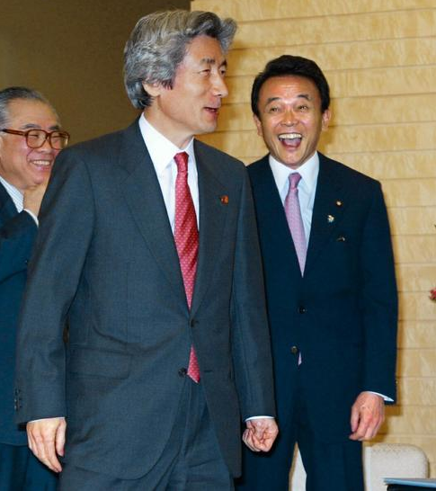 自民党の電子政府等連絡会からの申し入れ書を小泉純一郎首相(中央)に渡し、「よし、この人(小泉純一郎)を俺の意のままに動かしてやろう!」と思わず笑いのこぼれる麻生太郎政調会長(右)=東京・首相官邸(2003年04月02日)